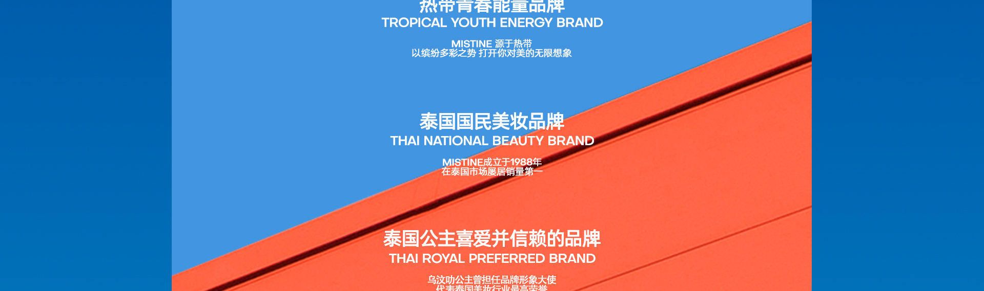"Mistine蜜丝婷"来自于东南亚自由国度——泰国 缤纷色彩灵感孕生了属于Mistine的多变妆容宇宙 在Mistine的异域王国里, 美有无限种可能,舒适感优于一切 热情由心,选择由我 MY CHOICE,MY PASSION!